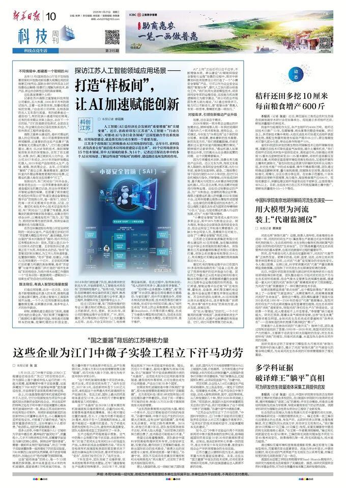 2026年1月21日,《新华日报》以《探访江苏人工智能领域应用场景——打造“样板间”, 让AI加速赋能创新》为题,报道了公海jcjc5500等入选江苏省“前沿技术应用场景建设示范名单”企业,在应用场景建设方面的实践与成效。